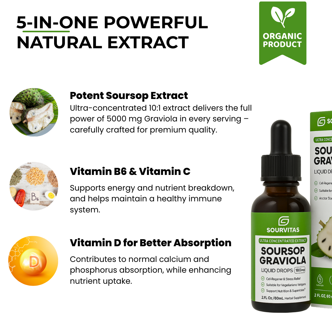 We've made it our mission to bring the incredible benefits of Soursop to everyone! That's why we proudly present the world's first 100% organic soursop extract!